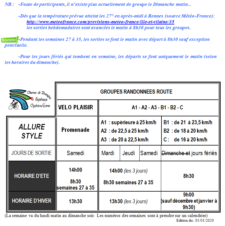 Vous pouvez nous rencontrer et rouler avec nous lors de 3 sorties (conforme aux préconisations de la ffvelo) avant d’envisager une adhésion annuelle. Départ Parc de Loisirs, Chartres de Bretagne, les mardi, jeudi et samedi à 13h30 en hiver, ou 14h en été.
